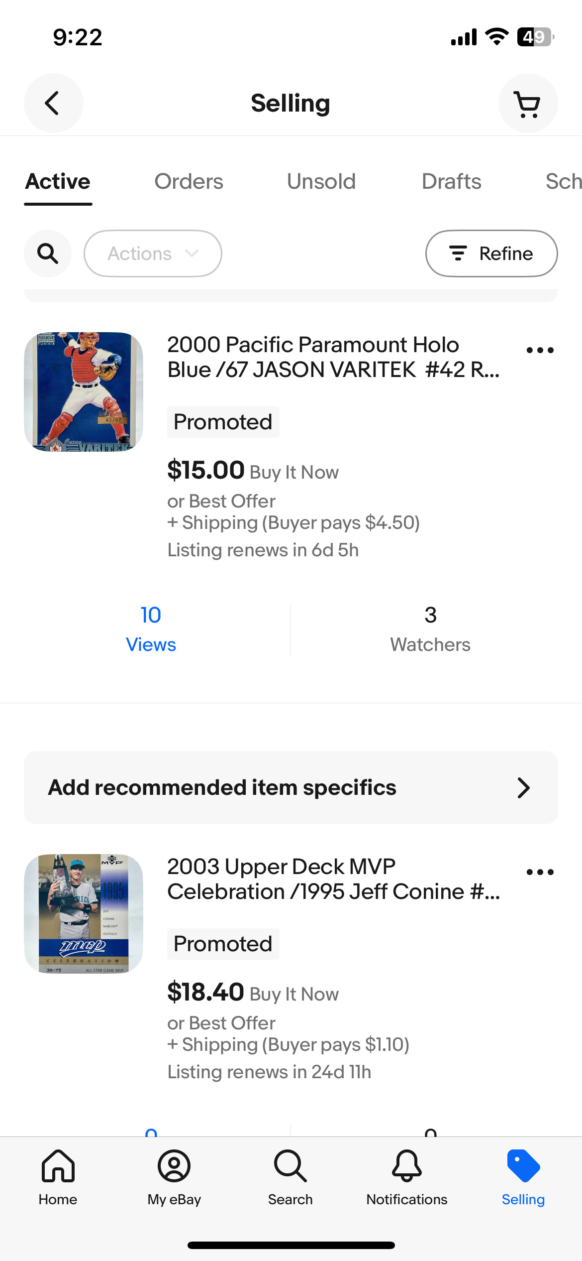 One seller lists a Jason Varitek at $15 with $4.50 shipping, while another lists a Jeff Conine at $18.40 with $1.10 shipping.