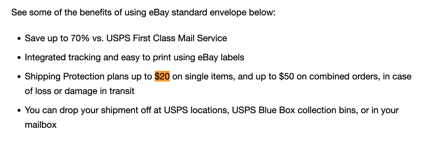 Of course, this strategy only works if you're comfortable using eBay Standard Envelope for shipping. Some sellers avoid it due to concerns about lost shipments, and I totally get that. To put your mind at ease eBay DOES provide seller protection for sales up to $20 that are shipped via eBay Standard Envelope.